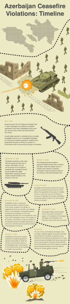 During the 44-day war, Armenia and Azerbaijan first reached a ceasefire agreement brokered by Russia. The humanitarian ceasefire that was to start on October 10 was violated by Azerbaijan on the same day.